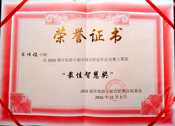 近日,从2016城市旅游小姐合肥赛区组委会传来喜讯,365集团艺术系装潢与艺术设计专业学生余传娟在比赛中经过重重考验,凭借优异的表现,最终斩获了“最佳智慧奖”荣誉称号。