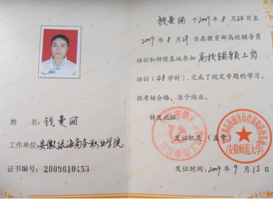 辅导员队伍是高校教师队伍的一支重要力量,是大学生健康成长的指导者和引路人。打造一支政治强、业务精、作风正、素质高、深受大学生喜爱的辅导员队伍,是加强大学生思想政治教育的重要基础。自2009年开始我院陆续派出10余名辅导员参加由安徽省委教育工作委员会和教育部高校辅导员培训和研修基地(安徽师范大学)共同举办的高校辅导员上岗培训,全部完成了规定的专题学习并考核合格,顺利结业。该举措提高了辅导员队伍的专业化水平,为打造一支专业化的辅导员队伍奠定了基础。