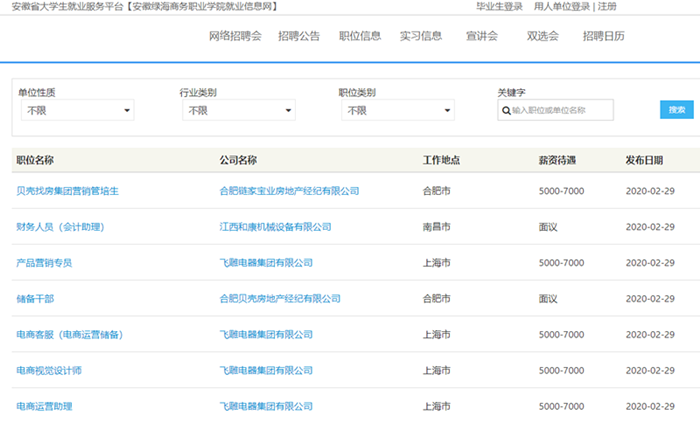 求职招聘“上云端”。面对疫情防控对毕业生就业工作带来的新挑战,学院暂停举办各类线下形式的校园招聘活动,组织毕业生参加安徽省大中专毕业生就业信息网春季网络招聘会。同时,积极与企事业单位、校企合作单位对接用人需求,为毕业生和用人单位提供求职信息服务。目前,包括海尔集团、安徽顺丰速运、永辉超市、老乡鸡、贝壳网等在内的83家企业进驻安徽绿海商务学院会场,提供岗位超过4700个。