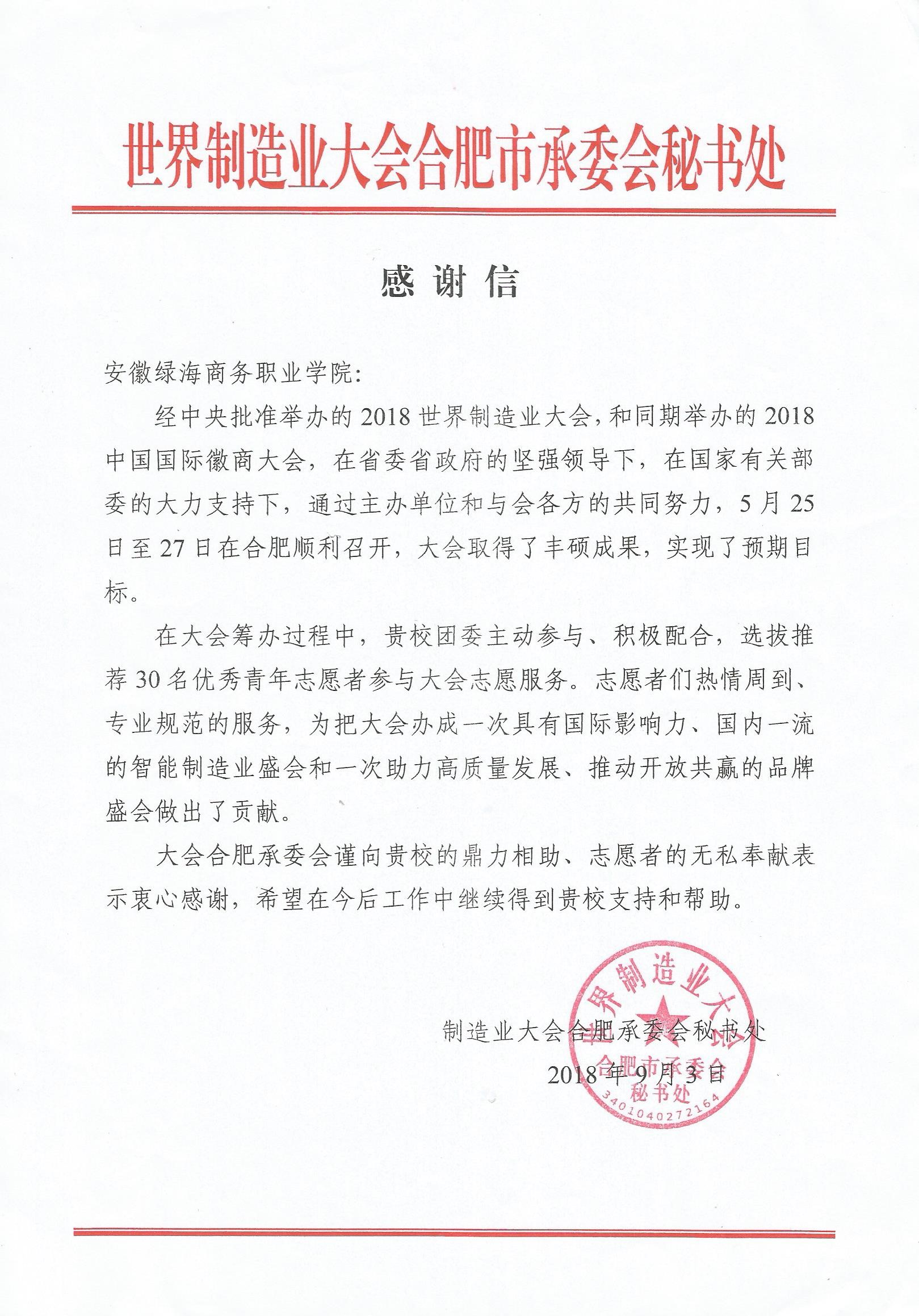 2018年5月,2018世界制造业大会暨2018国际徽商大会在合肥世界制造业大会在合肥召开,365集团作为省内唯一一所高职院校应邀参与志愿服务,30多名志愿者们热情周到、专业规范的服务,为把大会办成一次具有国际影响力、国内一流的智能制造业盛会做出了贡献,受到承委会的感谢和赞扬,成为播种志愿文化和绿海文化的形象大使。