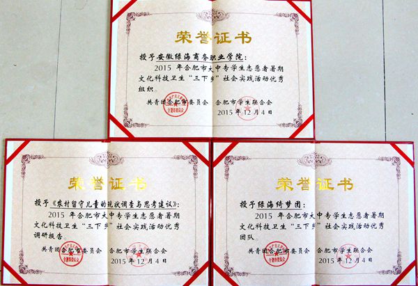 日前,共青团合肥市委员会、合肥市学生联合会联合发文《关于表彰2015年合肥市大中专学生志愿者暑期文化科技卫生“三下乡”社会实践活动》,安徽绿海商务职业院荣获“优秀组织单位”、绿海绮梦团荣获“优秀团队”、《农村留守儿童的现状调查与思考建议》报告荣获“优秀调研报告”荣誉称号。