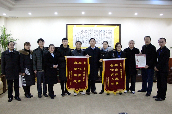 1月5日下午,同庆楼集团总经理王寿凤、人力资源部总经理王美凤、院校合作部经理桂金一行向学院赠送“校企共发展 合作育人才”锦旗。董事长陈孝云、党委书记江传瑞、院长许崇正、党委副书记张以亭、院长助理熊名文,旅游系主任张雪峰、副主任刘婷等接待了王寿凤一行。