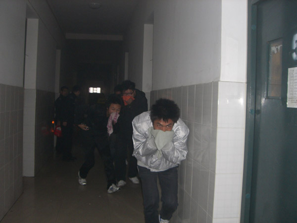14日中午,保卫处在女生1号楼组织了一场火灾逃生演习活动。当日中午1点,组织人员在一楼卫生间点燃物品,顿时弥烟四起,同学们用湿毛巾捂住口鼻迅速奔出宿舍。此时组织人员高声提醒大家不要拥挤,在他们的指挥号令下,从同学们疏散引导到事故现场的险情抢救,从后勤保障到现场保护,都迅速有序地进行。