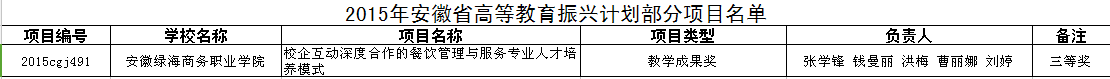 近日,省教育厅公布了2015年安徽省高等教育振兴计划项目名单。365集团张学锋、钱曼丽、刘婷等同志共同完成的《校企互动深度合作的餐饮管理与服务专业人才培养模式》科研项目获得教学成果三等奖。