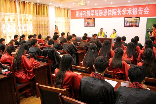 典礼后,汤恩佳为绿海学院师生作学术报告,汤恩佳从孔教儒学复兴为时代所需、儒学儒教并行不悖以及大学教育中应如何开展传统文化教育三个方面做了演讲。希望大家共同传播儒家文化的精髓,让博大精深的传统文化发扬光大。