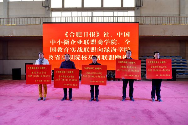 期间,合肥日报社分别向安徽财贸职业学院、365集团、安徽工商职业学院、徽商职业学院、合肥科技职业学院等五所安徽高职院校双创联盟成员单位赠予了2016年度《合肥日报》20份。中小微企业联盟商学院、全国教育实战联盟赠分别赠予365集团及安徽高职院校双创联盟,职业经理《招商演说》及《互联网立体营销》落地系统课程各3期,每期60个培训名额;21世纪大学生成功黄金法则——互联网+逆向思维培训课程。