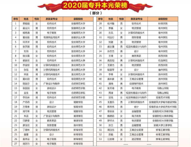 为满足同学们的专升本需求,学院成立“专升本研究院”,与安徽知名专升本机构合作,采取小班制教学,定制化培养,为学生参加专升本考试提供良好的学习氛国和可靠升学保障,学院2020届毕业生专升本录取人数占报考人数的55%,以下是部分学生录取学校名单。
