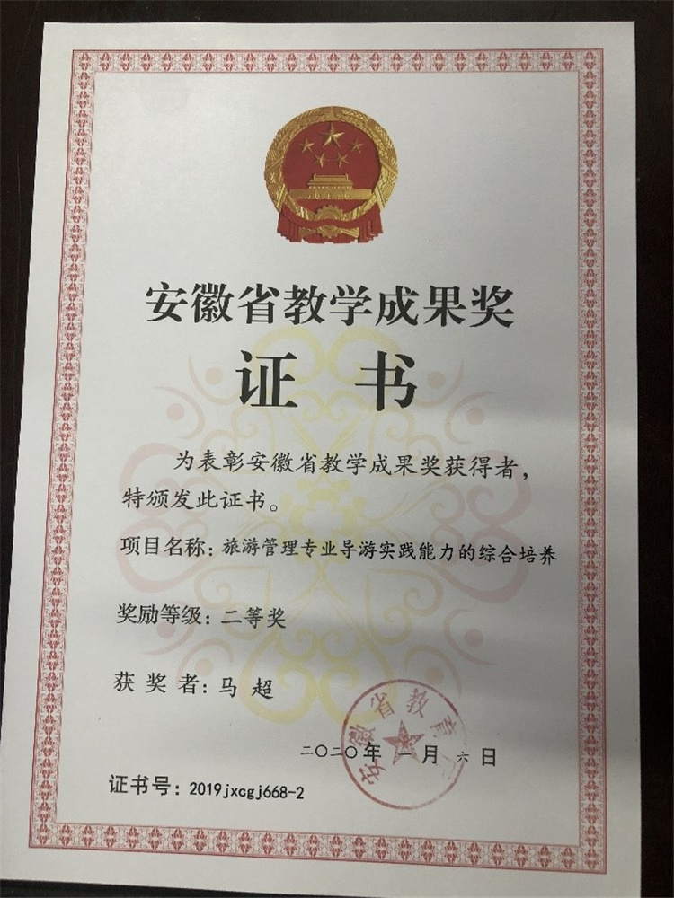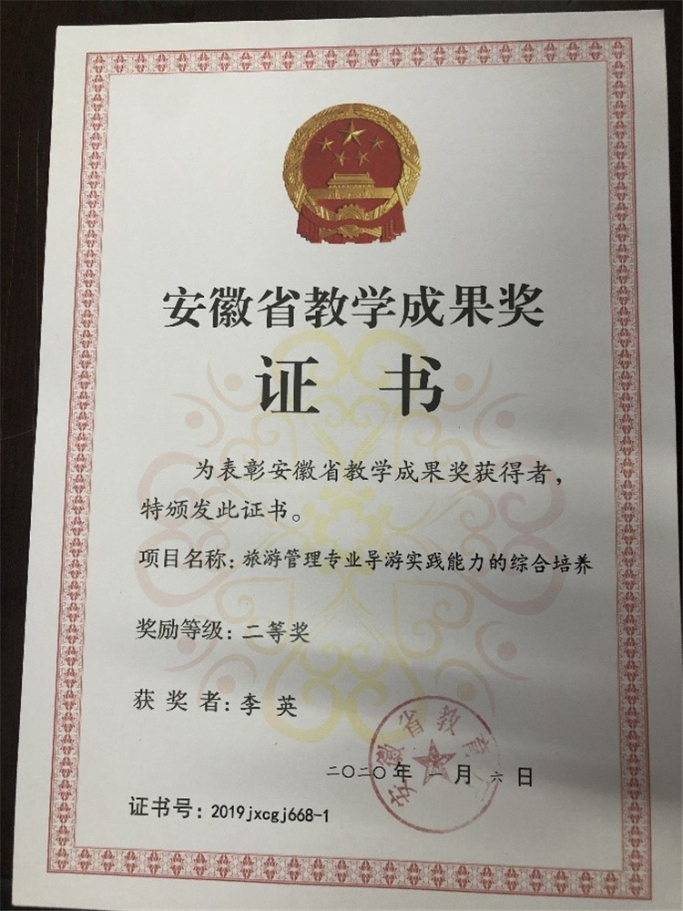2019年,本专业的教学研究项目“旅游管理专业导游实践能力的综合培养”获得安徽省教学成果二等奖。