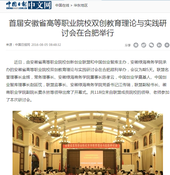 《中国日报》——首届安徽省高等职业院校双创教育理论与实践研讨会在合肥举行