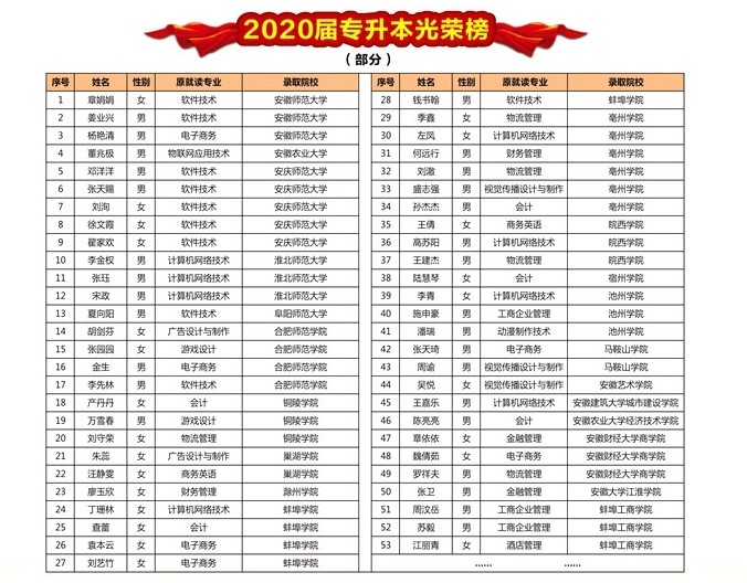 为满足同学们的专升本需求,学院成立“专升本研究院”,与安徽知名专升本机构合作,采取小班制教学,定制化培养,为学生参加专升本考试提供良好的学习氛国和可靠升学保障,学院2020届毕业生专升本录取人数占报考人数的55%,以下是部分学生录取学校名单。