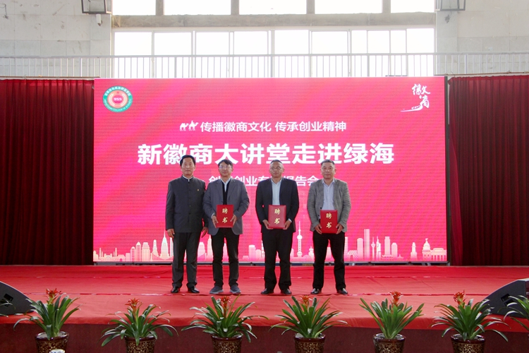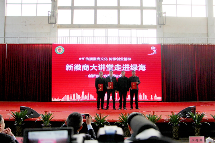 王唤明主任作了《徽商文化与徽商精神》专题报告,阐述了徽商文化的根源、核心、发展脉络,让人领略徽商精神的独特魅力和创新思想、内核品质。黄自云董事长结合自身企业发展历程分享了《大学生创新创业意识培育与思考》,对大学生创新创业提出具体思考和指导路径。报告结束后,与会企业家一行还与学生进行积极互动,就绿海学子提出的创新创业方面问题进行探讨和交流。