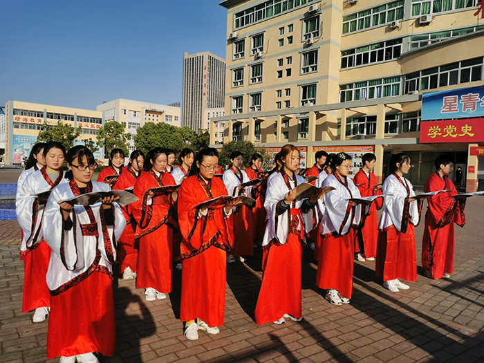 2019级学生谢耀强代表学生庄严宣誓《学生宣言》,同学们声情并茂的宣誓体现着绿海学子的自信、责任和当担。随后,师生齐声诵读《大学》篇章,文以载道,道在经典,他们句句有力,字字铿锵,展现了美好的中华传统文化,让同学们感受到了国学经典的魅力。