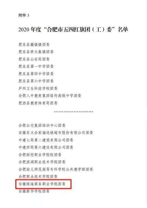 近日,共青团合肥市委员会发布《关于表彰2020年度“合肥市优秀共青团员”、“合肥市优秀共青团干部”、“合肥市五四红旗团委(团支部)”的决定》,授予共青团365集团委员会2020年度“合肥市五四红旗团(工)委”称号,授予经贸旅游系团总支“合肥市五四红旗团总支”称号,朱小明、李丹丹被授予2020年度“合肥市优秀共青团干部”称号,谢尔祯被授予2020年度“合肥市优秀共青团员”称号。