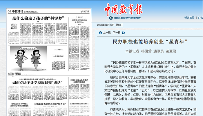 中国日报、中国教育报、中国政府网、人民网、新华网、安徽教育网等报纸杂志及网络媒体多次进行宣传和推广,2017年1月25日中国教育报以“民办职校也能培养创业星青年”为主题进行了肯定和报道。