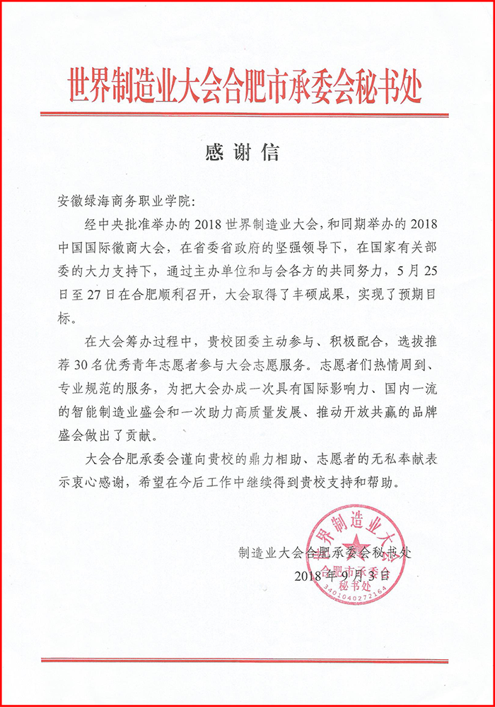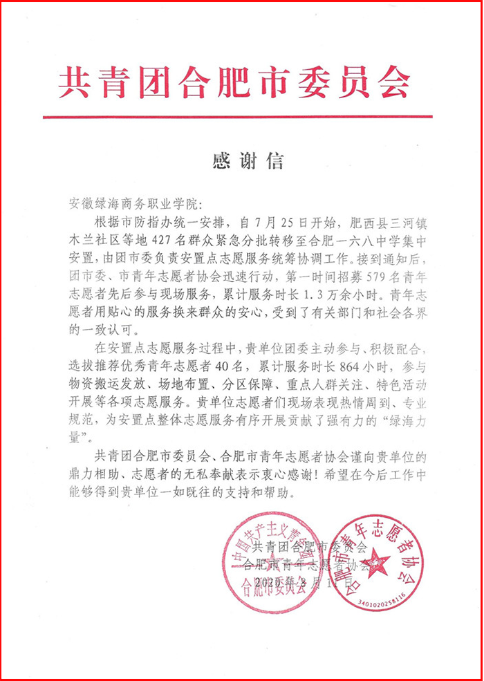 2020年9月1日,合肥团市委书记专程来到绿海学院看望团干和绿海星青年志愿服务团成员,送来感谢信及为学院专属定制的青年志愿者《防汛救灾纪念册》。对学院志愿者在防汛安置点志愿服务中热情周到、专业规范的服务表现给予高度评价,对学院的鼎力相助、志愿者的无私奉献表示衷心感谢。