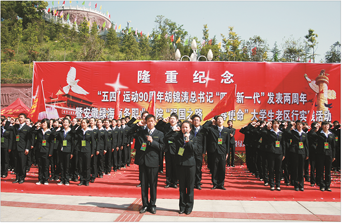 2009年5月4日,绿海星青年在金寨县红军广场上庄严选读《学生宣言》,争做具有坚定理想信念、丰富人文情怀、高超技术能力、仁爱合作精神的“四有”星青年,他们重走长征路,慰问老红军,向革命烈士陵园敬献花篮。 |
