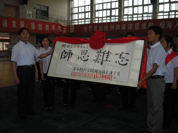 学院董事长陈孝云在表彰大会上首先对获奖的先进集体和个人及特殊贡献奖的师生表示祝贺,同时强调,大学铺就成才路,绿海架设幸福桥,加强大学生思想政治教育是一项长期而艰巨的任务,开展丰富多彩的社会实践活动是培养报效祖国、服务人民、融入社会、政治合格、素质全面的社会适应性商务人才的重要途径。志走强国之路,不辱青春使命是青年大学生的责任和追求,让我们以此次活动为起点,以胡锦涛总书记有关五四讲话为动力,坚定自己的报国志,殷切的为民心,顽强的学习力,饱满的创造情,以丰硕成果和优异成绩向祖国60华诞献礼。