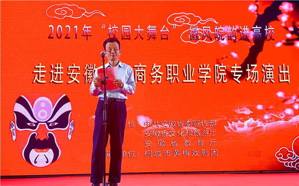 演出开始前,亓四华代表学院对艺术家们的到来表示热烈欢迎和衷心感谢,他指出“黄梅戏进校园”活动对增强校园的文化氛围、提高审美素养、塑造健全人格、扩展知识面和培养高尚情操有着不可替代的作用,作为新时代的大学生要在活动中认识党和国家文化强国战略,汲取文化精粹,传承高雅艺术。