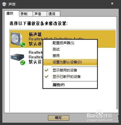 2、也可打开所需的声音调节默认设备的对话框。然后更改耳机为扬声器,选取扬声器设为默认值即可确定。
