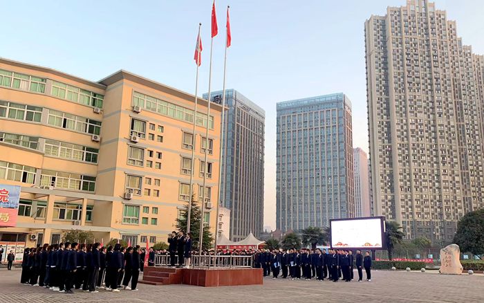 上午七时,国旗护卫队成员迎着朝阳,以饱满的热情,庄严地护送国旗入场。伴随着雄壮、激昂的旋律,全体师生庄严肃立,高唱国歌。在师生的注目礼下,鲜艳的五星红旗伴随晨曦冉冉升起,嘹亮雄浑的国歌声响彻校园。