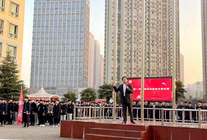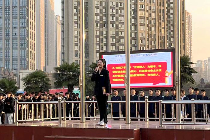 陈孝云老师发表国旗下讲话,他言辞真切、满含深情从宏观、微观和直观三方面高度总结了学院升国旗仪式的九大重要意义,同时对周一升国旗仪式常态化、规范化提出具体要求。陈孝云强调,学院将其作为户外思政教育课堂,引导学生青春永向党、建功新时代、争创新作为。此举作为推进学院“三全育人”工作的具体抓手,鼓励学生自强不息,知行合一,坚定理想信念,以高标准要求自己,以高目标勉励自己,争做最好的时代星青年!