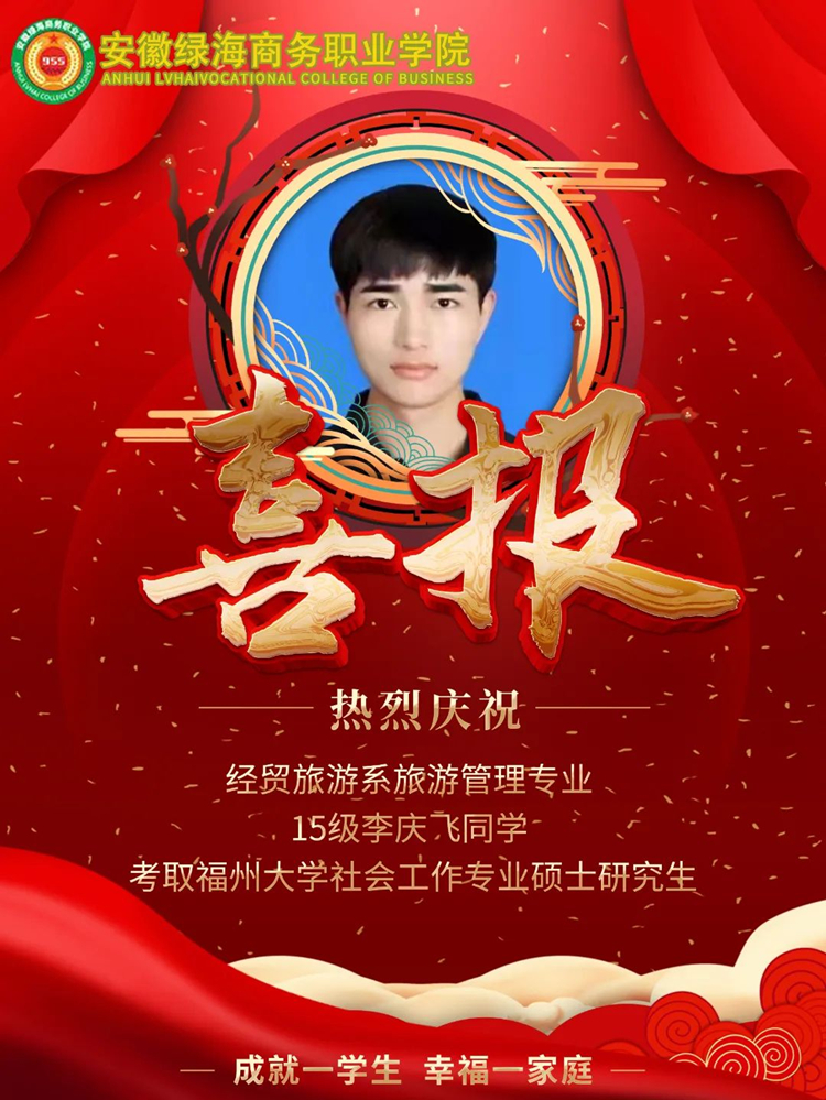 李庆飞,男,经贸旅游系旅游管理专业2015级毕业生,2022年考取福州大学社会工作专业硕士研究生。