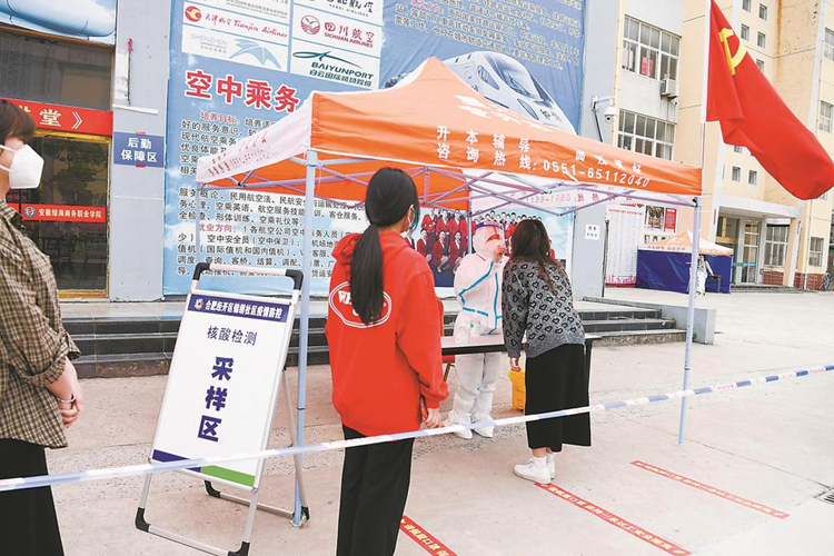 4月17日,合肥市经开区,安徽绿海商务学院工作人员在进行区域核酸检测演练。本报记者 温沁 摄