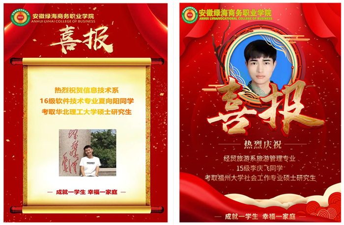 青春由磨砺而出彩,人生因奋斗而升华。绿海毕业生考研喜讯传来,学院师生倍感振奋,在此对考研成功的同学表示热烈祝贺!同时也希望其他同学们,要以他们为榜样,在青春的赛道上奋力奔跑,顽强拼搏、勤奋刻苦,用汗水和努力浇灌出成功之花!