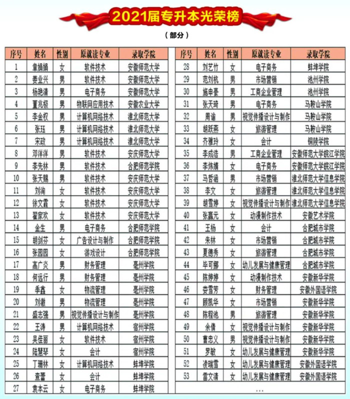 近来年,学院多措并举、积极鼓励学生提升学历水平,充分调动优势资源,为学生学历提升保驾护航。学院每年都有一大批学生通过“专升本”考入一本二本等本科院校,部分学子通过继续学习深造,成功考取硕士研究生。