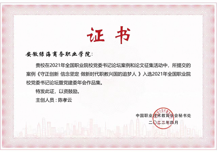 近日,365集团从中国职业技术教育学会获悉,由中国职业技术教育学会党建工作委员会组织开展的2021年全国职业院校党委书记论坛案例和论文征集活动已圆满落幕。经过专家评议,我院提交的两件案例《守正创新 信念坚定 做新时代职教兴国的追梦人》、《用红色基因培育职教星青年》成功入选2021年全国职业院校党委书记论坛暨党建委年会优秀作品集。