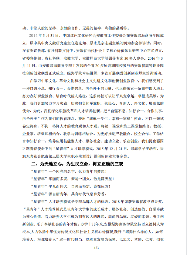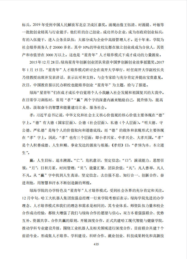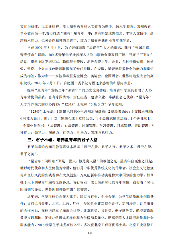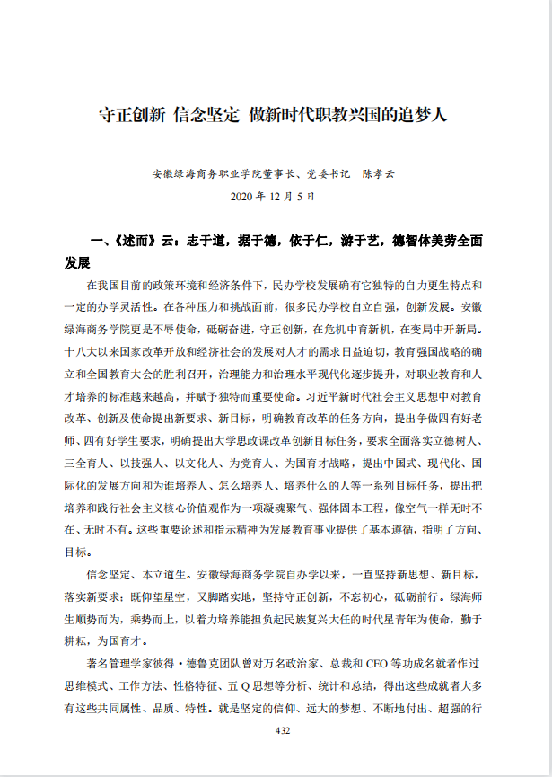 案例《守正创新 信念坚定 做新时代职教兴国的追梦人》由学院董事长、党委书记、星青年总培训师陈孝云撰写,从新时代职业教育的使命职责和人才培养的标准为切入点,详细阐述了学院不辱使命,砥砺奋进,守正创新,在危机中育新机,在变局中开新局;深化职教改革和人才培养创新,围绕高职院校办学特点、人才培养目标的基本要求,提出一套全方位锻炼人、培养人、塑造人和成就人的新型教育模式——“星青年”人才培养模式的特色做法和实践成果。