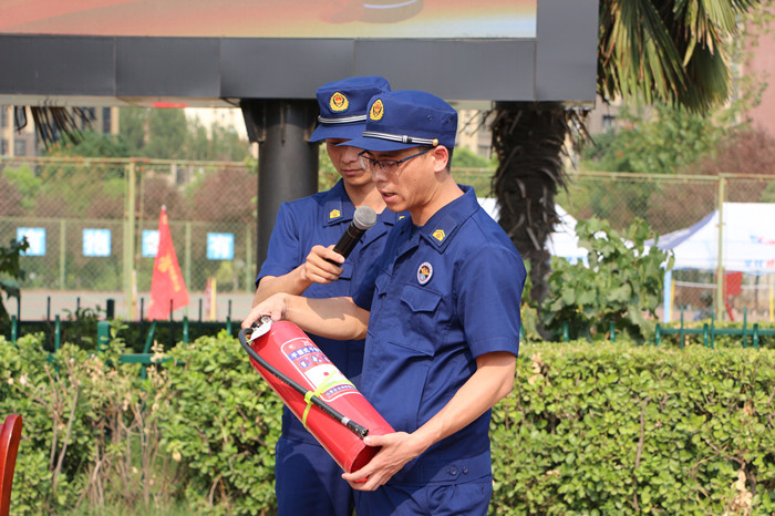活动中,夏超教官采取面对面讲解和现场操作演示的方式,用生动活泼的语言为全体人员介绍了消防法律法规、常见灭火器材的正确使用、如何扑灭初期火灾、如何火场自救以及逃生等消防安全常识。结合近期发生的几起影响较大的火灾事故案例,从防火、灭火、逃生、自救四个方面,分析了火灾发生的原因,造成的严重后果以及对社会的危害。现场演示了灭火器功能用途以及操作程序。随后,夏超教官现场指导学生代表使用消防设备设施进行实际操作演练,全体参会领导、师生员工进行现场观摩,通过现场演练使大家对消防工作的重要性有了更深刻认识。