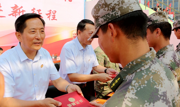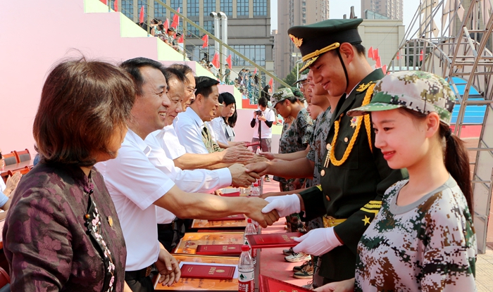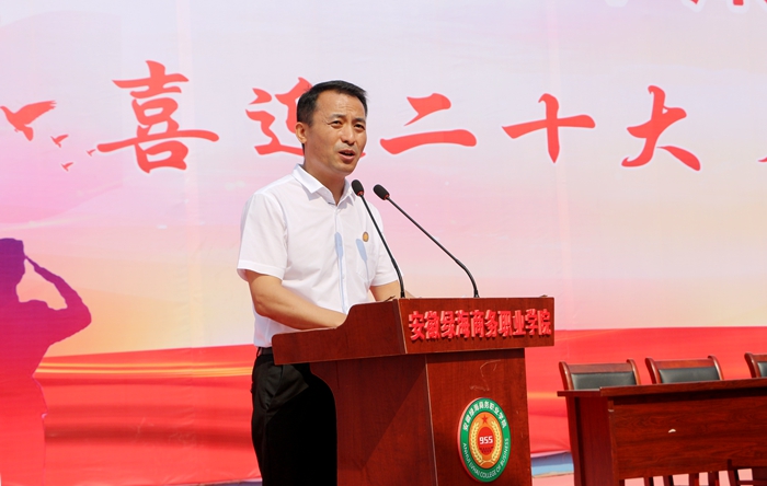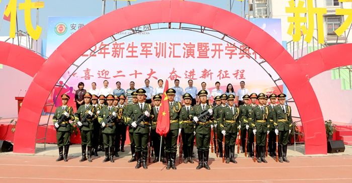 学院党政领导班子,肥西县人民武装部副部长刘晓峰等领导共同出席,大会由党委委员、文化行政总监张以亭主持。学院全体教职工、军训教官、全体新生参加。