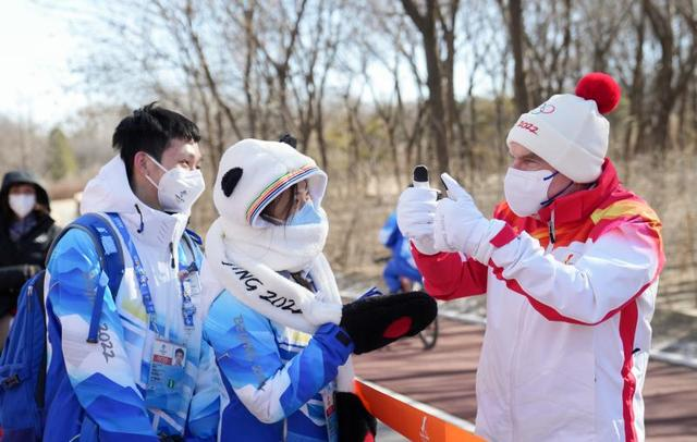 国际奥委会主席托马斯·巴赫(右)在火炬传递前与志愿者交流。新华社记者 鞠焕宗 摄