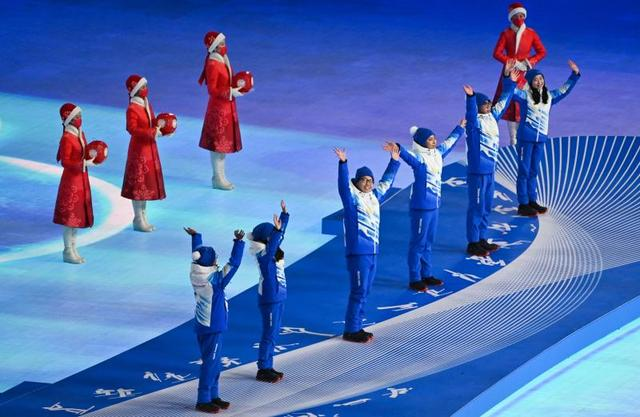 在北京冬奥会闭幕式上,志愿者向观众打招呼。新华社记者 李然 摄