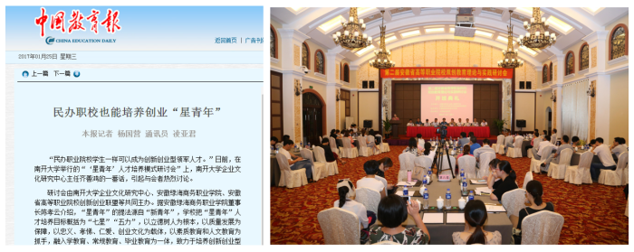 2017年1月26日,《中国教育报》以“民办职校也能培养创业‘星青年’”为题,报道了绿海学院独创的“星青年人才培养模式”,此后这一人才培养模式又获得2018年“安徽省教学成果二等奖”。“问渠那得清如许,为有源头活水来”,星青年的星火闪耀,只是“星青年人才培养模式”成功育人的一个缩影,从中折射出的是绿海“星青年”的品质、能力和素养,闪耀着因材施教、琢玉成器的智慧光芒。