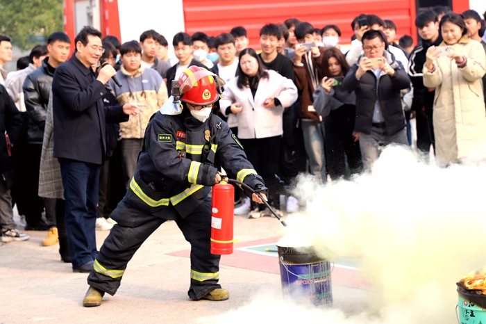 演练现场,黄宣铭教官针对突发火情时如何正确做好个人防护,保持冷静,克服惊慌、恐惧心理,掌握逃生要领,正确选择逃生途径,减少烟、火危害,熟悉疏散路线、集结点等进行详细讲解。随后,教官现场指导学生代表使用灭火器具进行实际操作演练。