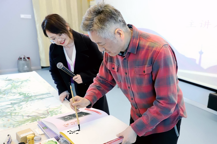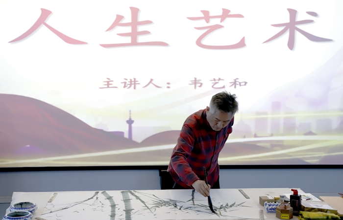 吴珉对韦老师的创作经历和成果进行了详细介绍后,韦艺和老师以《人生艺术》为主题展开讲座,他语言风趣幽默又热情洋溢,从创作背景、取材、体会等方面,生动诠释了绘画与时代、审美、表现上的意义与关系。“我和竹子关系很好”,他动情地讲述了他对竹子有着一份异于常人的爱恋和痴迷,爱竹、画竹、做竹是他人生里的三张境界,与竹共舞是一种幸福。他分享了自身创作经历,对所创作的绘画作品从内涵到形式进行了解析,他用诗人的情怀,将真情、诗意融入作品之中,以文学的语言、书法的线条传达美的信息。
