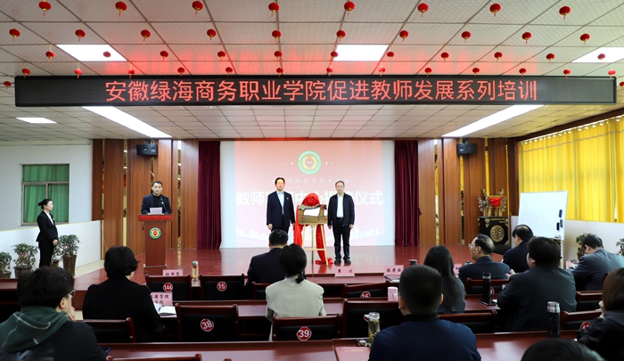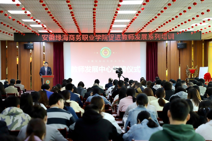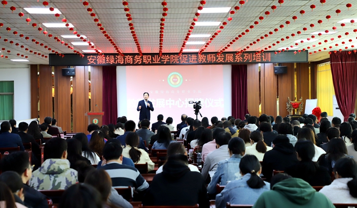 安徽当代社会主义核心价值体系研究中心主任、绿海学院董事长、星青年文化研究院院长陈孝云为教师发展中心揭牌并作讲话。讲话饱含深情,崇校尊师,充满激励,提出殷切期望。他表达了对教师快速成长的牵挂,对绿海高质量发展的期待,对星青年学子健康成长的关心。他以韩愈《师说》为切入点,表达对职教“大咖”覃川教授的尊敬之情,并阐发了对“大”的深刻理解,即遵循、践行“传道授业解惑”之师道,从百年党史中汲取伟大的精神力量,以自强不息的精神,增强职业自信、丰富学识、提升境界、提高能力,不负社会及家长期待,立志职教报国、潜心教书育人。他指出,作为学校“12345工程”的重要构成,教师发展中心的成立顺应了时代的发展、符合绿海发展需求,要进一步加深对教师发展重要性的认识,以切实举措强化师德师能,为全面落实学院“十四五事业发展规划”提供坚强的人才支撑。以绿海人积极向上之势,促进教师发展;以绿海人用爱赋能之行,引领学生成长;以绿海人躬身奋斗之姿,实现绿海梦。