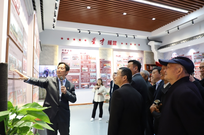 在安徽省当代社会主义核心价值体系研究中心主任、绿海学院董事长、星青年文化研究院院长陈孝云的陪同下,束道文书记一行参观了学校党建文化广场、党建文化馆、智慧思政课教室、教育部“百千万工程”产教融合实训中心、星青年文化长廊。作为从马场村走出来的创业者、职教追梦人,陈孝云深情回顾了三十多年来学校从马场办学起步到升格为中职、高职院校的发展历程,讲述了绿海学院自创办以来的发展变化、人才培养成果,对家乡父老乡亲给予学校发展的关注关心表达了诚挚的感恩之情。他强调,正是在家乡父老乡邻的关爱呵护下,自己得以健康成长,在党的教育培养下,得以成为一名信念坚定的共产党员。马场村五星级党支部的风采让他很是欣慰、备受鼓舞。通过三十年教育报国的不懈实践与反复锤炼,心中更加坚定红色信念,并把这种共产党人的艰苦奋斗、无私奉献精神投入到职业教育事业之中。绿海学院在全省民办高等职业院校率先创建打造“三位一体”党建引领、思政教育阵地,就是坚持“为党育人,为国育才”的初心,全面加强党的领导和阵地建设,用一流党建引领一流事业发展,全面落实立德树人根本任务和职业教育高质量发展服务地区的重要任务。