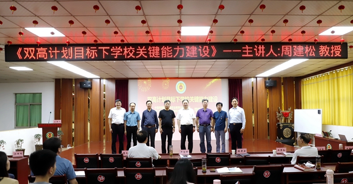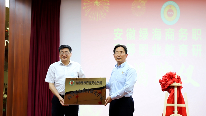 中国高等教育学会职业技术教育分会会长、知名职教专家周建松教授为绿海学院高等职业教育研究中心揭牌并作《双高目标下的关键能力建设》专题报告