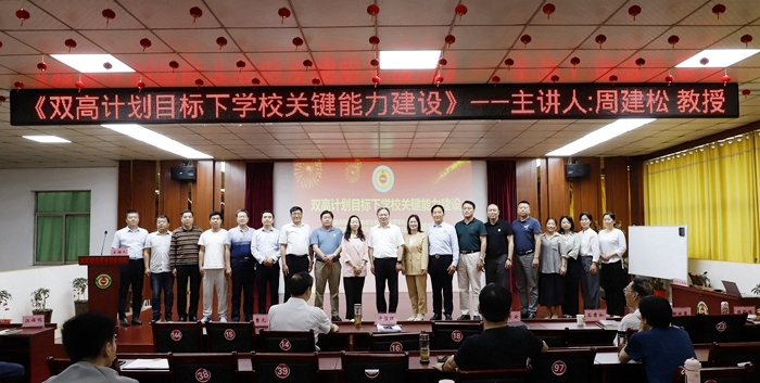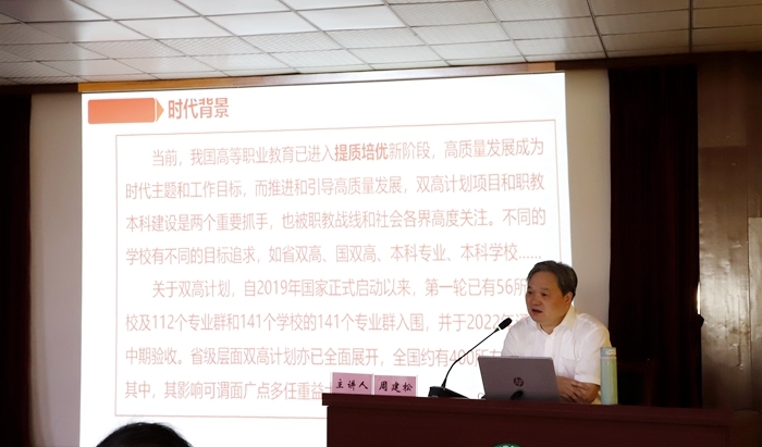 周建松教授介绍了“双高计划”的建设背景,详细解读了中共中央办公厅、国务院办公厅印发的《关于深化现代职业教育体系建设改革的意见》中对“提升职业学校关键办学能力”的具体要求,分别从党的领导力、教学内涵力、队伍战斗力、服务贡献力、文化引领力、资源整合力等六个方面,结合丰富典型的实践案例,详尽系统地阐释了双高计划目标下学校关键能力建设的问题。