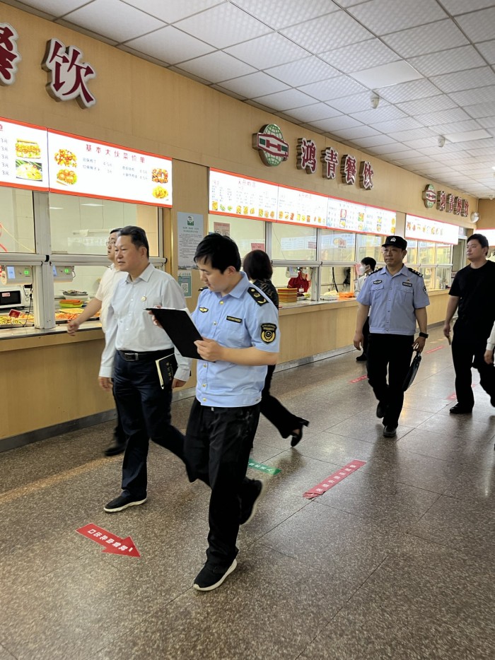 为全面压紧压实食品安全“两个责任”,筑牢食品安全严密防线,创国家食品安全示范城市,6月6日下午,市公安局食药环知森支队负责人董照曙、经开区市监局食药科负责人卞旭东来校进行食品安全包保督导。总务处负责人、食品安全总监邓奕成,学校食品安全员及一楼食堂相关负责人等全程陪同。