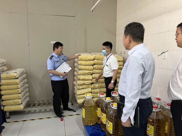 督导组首先查看了一楼食堂的主食库,询问米面油进货渠道、生产厂家、生产日期、使用情况等。每到一处,督导组都要现场查看卫生环境,先后对食堂的操作间、粗加工间、清洗间、备餐间、蒸饭间、食堂仓库等硬件设施和清洁消毒情况进行检查,并查验食品采购索证索票、食品留样记录等资料,详细了解“日管控、周排查、月调度”制度建立及运行情况,食品安全总监和食品安全员配备情况,食品安全主体责任落实情况。