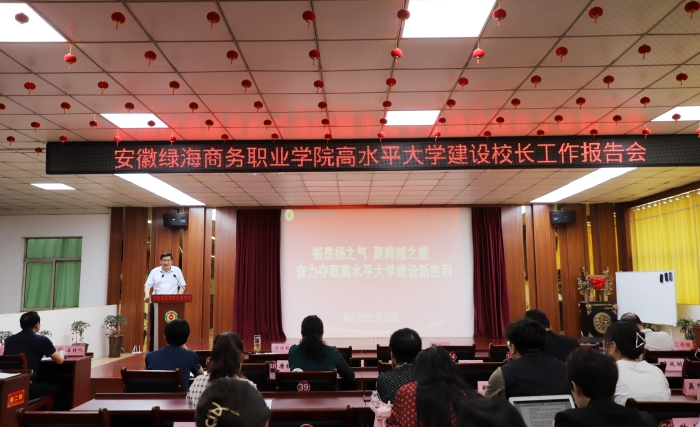 执行校长许信旺以《振昂扬之气 聚跨越之能,奋力夺取高水平大学建设新胜利》 为主题,作学校2022—2023学年第二学期工作报告。许信旺指出,2023年上半年学校在党建引领事业发展、全面推进高水平大学建设、提升人才培养质量、深化产教融合、推动教学诊改、打造高水平师资队伍、招生就业、提升服务能力等八个方面取得了不菲成绩;在全省民办高校和职教领域率先创建“党建文化广场”“党建文化馆”“智慧思政教室”三位一体的思政教育基地,艺术学院党支部在全省第二批高校党建“双创”工作成功创建“样板支部”,经贸旅游等学院学子在2022年安徽省职业院校技能大赛中多项夺奖,学校大力推进实施“12345”工程,筹备成立安徽数字创意职教集团、组建星青年讯飞人工智能产业学院、海尔商务智能产业学院等项目进展顺利,校长、书记访企拓岗111家。