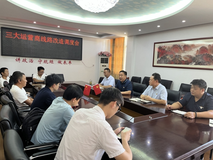 8月3日上午,学校召开三大运营商线路改造调度会,学校董事会董事孙圣祥,保卫处处长雷成法,宿舍管理科科长何家利,中国电信、中国移动、中国联通等三大运营商项目负责人和施工负责人参加会议,会议由总务处负责人邓奕成主持。