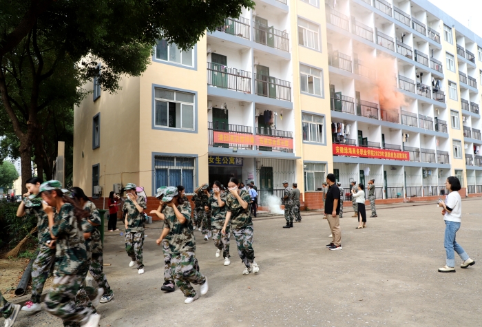 不到一分钟的时间,只见各宿舍楼内学生在辅导员、军训教官的指挥下,用沾满水的湿毛巾、手帕等捂住口鼻,低弯着腰,通过楼梯有序、快速地按预定的疏散路线紧急向篮球场集合点疏散撤离。与此同时,丹霞救援站消防救援车辆按预案路线拉响警笛进入现场。集合点各班辅导员立即清点人数,检查是否有受伤人员,确保每位同学成功疏散逃生。