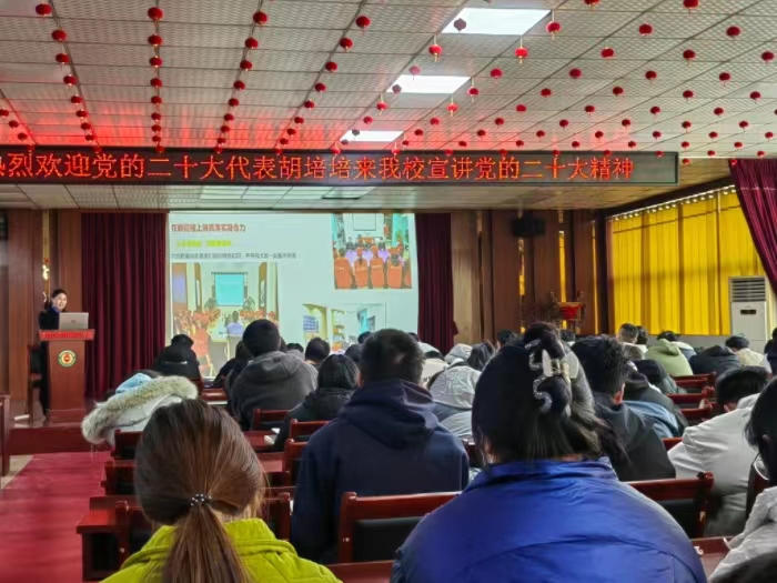 胡培培以“凝心聚力擘画复兴新蓝图,团结奋进创造历史新伟业”为题,从参会的经历与体会、党的二十大报告主要精神和贯彻意见三个方面,向师生分享了参加党的二十大时的所见、所闻、所感。热情宣讲了党的二十大的主题和主要成果、全面建设社会主义现代化国家的目标任务、坚持党的全面领导和全面从严治党等内容,并从坚持把党的创新理论与具体实践相结合,立足岗位建功立业的角度提出了贯彻建议。