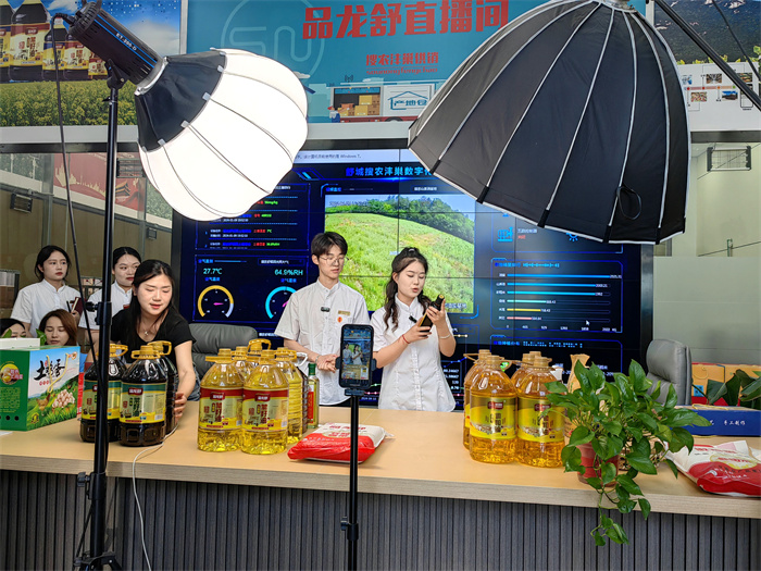 “这款香油无污染、零添加、原生态,是官塘村又一特色农产品,直播间的宝子们准备好了吗,上链接。”在官塘村沣巢电商基地的直播间,数字商贸与直播学院的同学们,正面对镜头讲解手中的粮油产品。