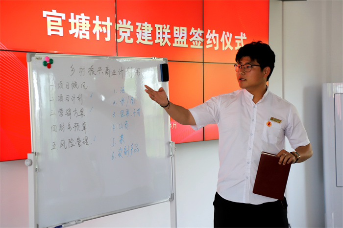 在官塘村党群工作室,学生们正在为乡村振兴出谋划策。通过对官塘村现场调研、访谈以及村领导的详细介绍,数字商贸与直播学院的学生们结合专业背景,现场撰写“乡村振兴商业计划书”,他们从科技、电商、旅游和公益等几个方面为产业发展和乡村振兴出谋划策,提出了具体方案。